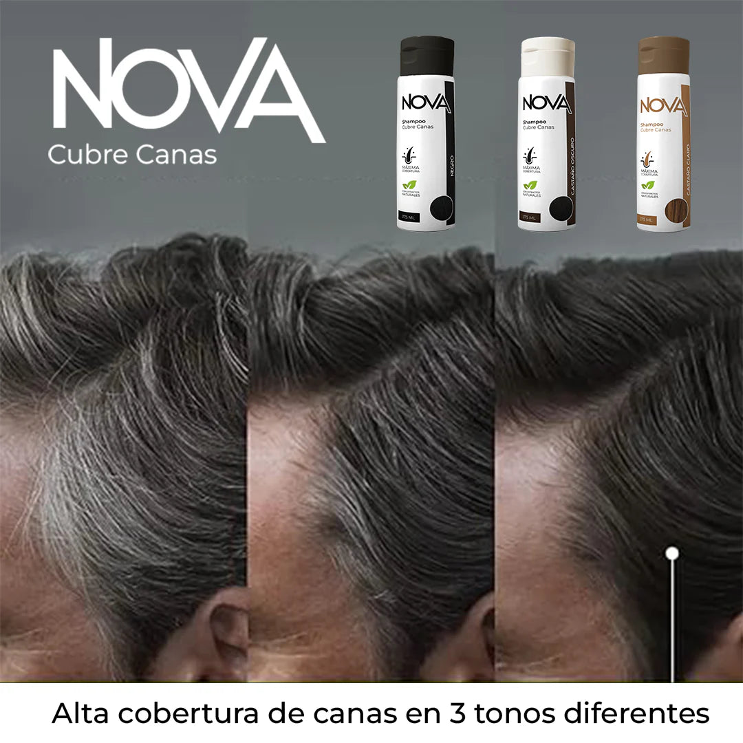 Llegó el Shampoo Nova, la solución ideal para quienes quieren eliminar las canas y mantener la salud de su cabello, todo en un solo paso. La innovadora fórmula de Nova cubre hasta las canas más rebeldes y, al mismo tiempo, nutre e hidrata tu cabello, dejándolo con un color vibrante y natural.Con tres tonos exclusivos y naturales, tu cabello tendrá un color uniforme, radiante y lleno de vida, todo esto sin comprometer la salud capilar. Nova no es solo un champú, ¡es el secreto para un cabello renovado y fabuloso!